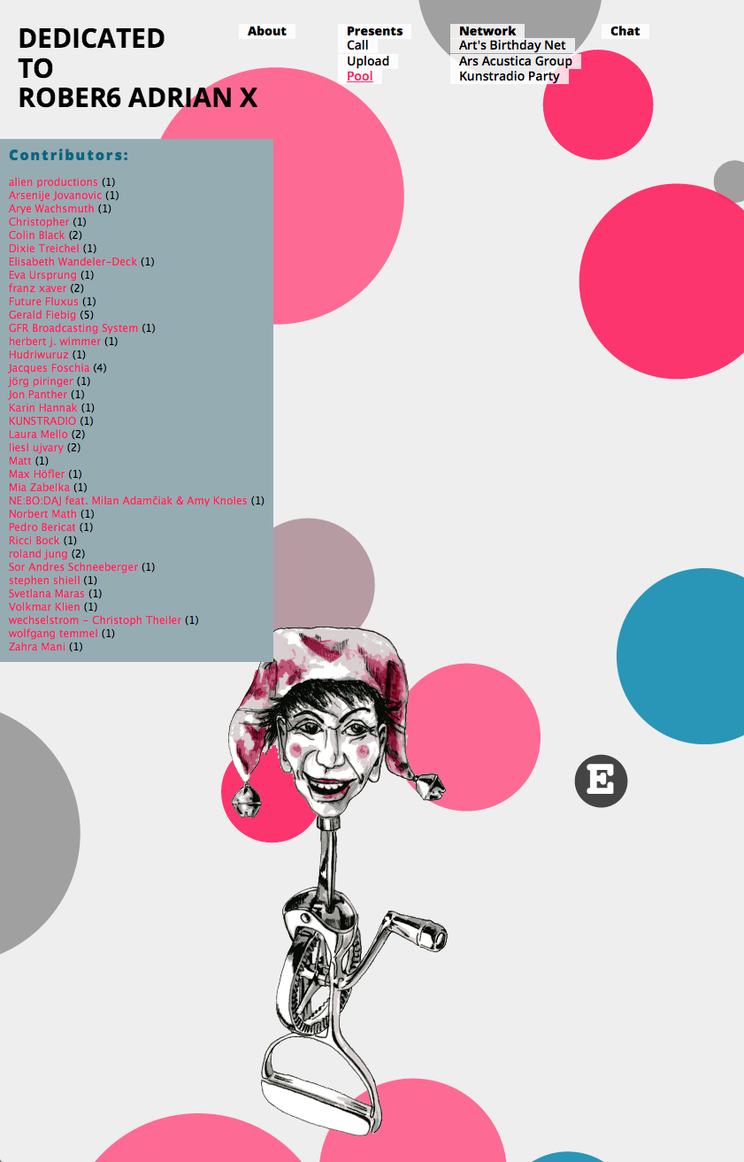 Celebrating Art’s Birthday is a tradition started by French Fluxus artist Robert Filliou who declared, on January 17th 1963, that Art had been born exactly 1,000,000 years ago when somebody dropped a dry sponge into a bucket of water. This year´s party is dedicated to the life and work of Robert Adrian X.